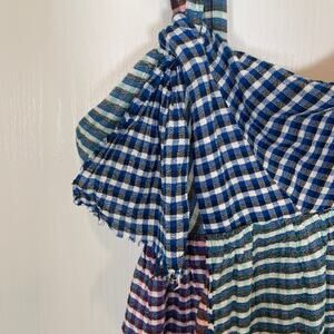 Blue, green, white, pink and orange gingham / check print Waverly Dress by Maeve, from Anthropologie. One shoulder strap with sweetheart neckline, fringe-y handkerchief hem. Stretchy smocked panel on back for a snug fit. Very good pre-owned condition. Bust across the front area measures approx. 16 inches (unstretched).