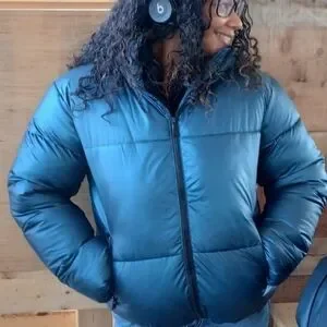 Stay warm and stylish with this metallic blue puffer jacket. Perfect for chilly days, it offers both comfort and fashion.