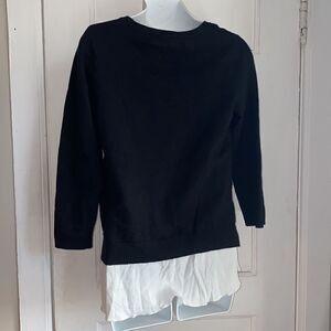Black cotton nylon spandex blend knit body with see through stripe pattern, white rayon viscose underlay that hangs 3” below sweater. Size XS, measures 17” from armpit to armpit and 25” from top of shoulder to bottom hem.