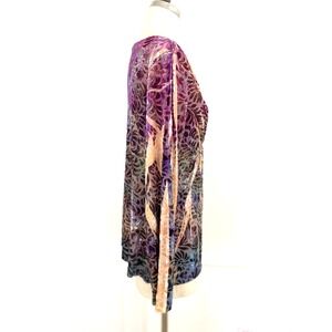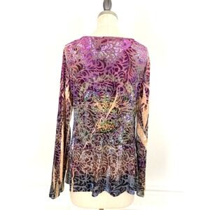 Make a bold statement with this stunning boho-glam burnout velvet top, featuring a deep V-neckline, long sleeves, and an eye-catching multicolor floral pattern. This sheer blouse blends iridescent shimmer, rich jewel tones (purple, peach, teal, and copper), and sparkling bead embellishments for a look that's both romantic and edgy.