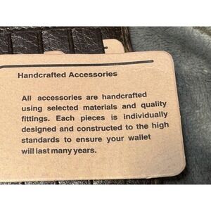Paper insert inside reads 'Handcrafted Accessories' and describes the wallet as handcrafted using selected materials and quality fittings designed to last many years.