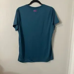 Teal short sleeve tee with bold pink and white logo. Comfortable and stylish. Perfect for casual wear.