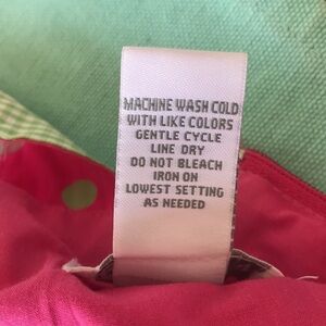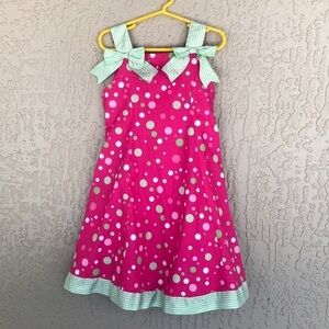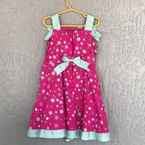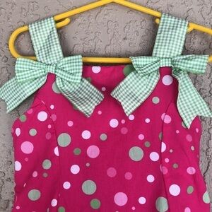 Bonnie Jean sleeveless sundress in a bright pink color featuring playful white, green, and pink polka dots paired with contrasting green and white gingham accents. Designed with wide gingham straps finished with bows, a coordinating back belt with snap closure, and a gently flared skirt with built-in netting for added volume. Fully lined with a comfortable fit, making this a perfect choice for spring and summer occasions. Size 5. See photos for measurements to ensure fit.