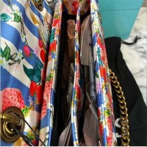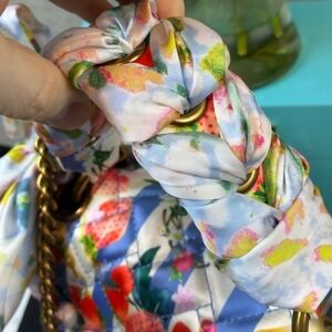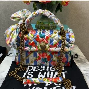 Brand new with tags, Kurt Geiger Satin Strawberries Kensington Bag. Gorgeous pattern, accented with brassy hardware, a jeweled eagle head, and a floral bow. Black fabric interior with 2 compartments. Comes with Kurt Geiger dust bag.
