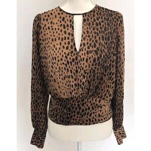 This Good American blouse in size 1 (SMALL) Iis long sleeve with a crew neck and keyhole opening, it is synched at the waist .It has a stylish leopard print design on a brown background.This lovely shirt is preloved and in great condition. Refer to photos for measurements.