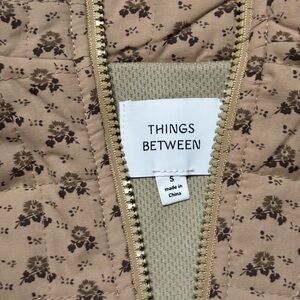 Charming Things Between quilted jacket featuring a soft neutral tan base with a delicate micro floral print throughout. Designed with a cozy hood, half-zip front, and lightly padded construction for warmth without bulk.