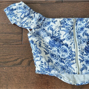 Blue & White Floral Ruffle Sleeve Crop Top size - 2