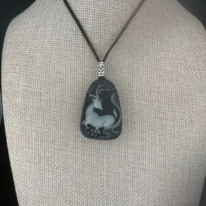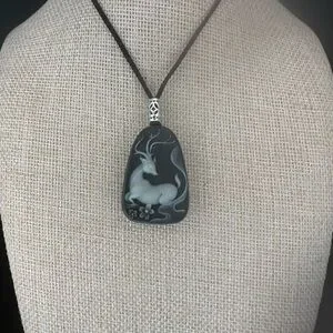 Tai Chi Stone Deer Pendant Necklace, Sterling Silver Accent on Adjustable Rope