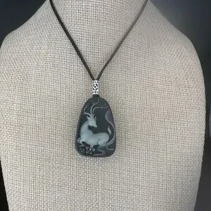 Tai Chi Stone Deer Pendant Necklace with Silver Accent on Adjustable Rope Cord