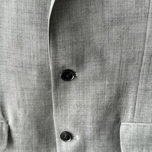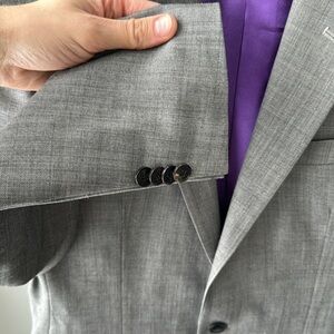 This is a fantastic suit jacket from Indochino. High end designer jacket in athletic slim fit. 38R or men’s medium. Intricate textured grey weave with purple lining. Excellent condition