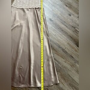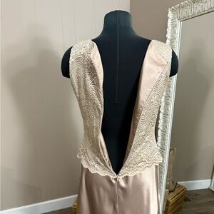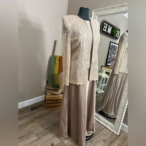 2 piece set. Gown has lace top with a-line satin skirt. Zipper back. Floor length.