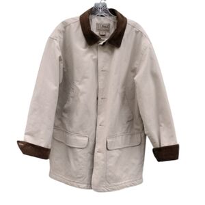 This Vintage LL Bean men’s Chore Field Coat in size medium is a classic and timeless piece made of durable cotton canvas with a corduroy collar. The button closure and long sleeves make it perfect for the winter, fall, and spring seasons, suitable for casual outings, workwear, or even a party. The beige color adds a touch of country charm, while the lined interior provides comfort. With its vintage appeal and iconic LL Bean brand, this coat is a stylish and functional addition to any wardrobe, suitable for outdoor chores or everyday wear.