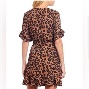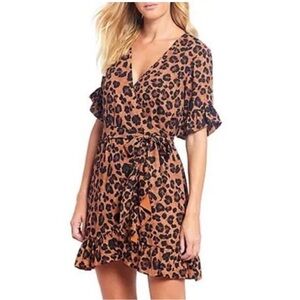 Stylish animal print mini dress. Features wrap design and ruffle sleeves. Ideal for a trendy look. Like new