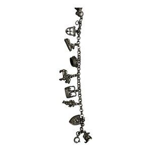This unique vintage pewter charm bracelet features a collection of intricately crafted charms inspired by British history and royalty. The bracelet is made of sturdy pewter links and includes detailed charms such as crowns, knights, a lion, a shield, and other iconic symbols. Each charm adds to the historical charm of the piece, making it a perfect accessory for collectors, history enthusiasts, or anyone who loves medieval and regal designs.