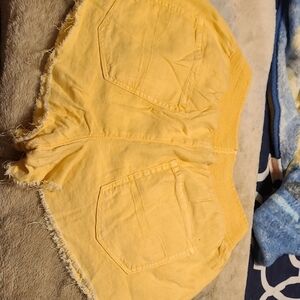 Vibrant yellow high waist shorts. Frayed hem for a trendy look. Perfect for casual wear.