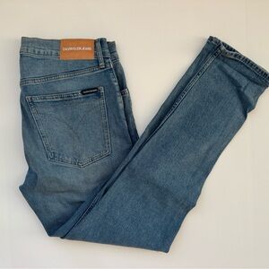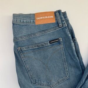 Classic Calvin Klein CKJ 016 denim in two staple washes — light indigo and black. Mid-rise with a slim/skinny leg and signature CKJ curved back pocket stitching. Great everyday neutral denim that fits clean and modern.