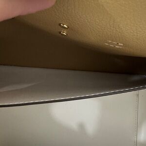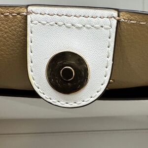 Beautiful Michael Kors tote. Very lightly used, in excellent condition Approximate dimensions: Top Length: 17 inches Bottom Length: 13 inches Height: 11 inches Depth: 6 inches Color: Optic White Size: Large (L) Straps: 10 inches FEATURES: Gold Toned Hardware Leather Material Michael Kors LOGO at Front Belted Accent Snap Top Button Closure 1 Zipper Pocket 1 Slip-in Pocket
