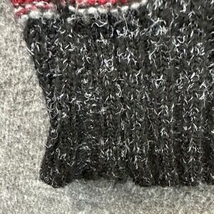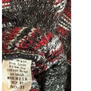A vintage Sweater Graphix crewneck sweater showcasing a striking geometric pattern. This piece features a dark gray base with intricate red, white, and gray zig-zag and stripe detailing throughout. Perfect for casual wear or adding a retro flair to your everyday outfits. There are some small areas where the knitting came undone please see pictures.