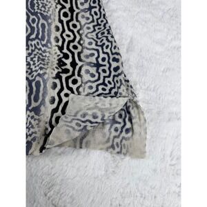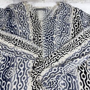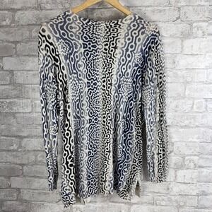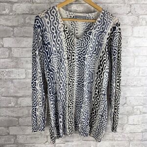 A symphony of elegance, this Neiman Marcus sweater exudes effortless style with its intricate abstract print in shades of blue, black, and white. This luxurious top is crafted from a blend of silk, cashmere, and wool, promising a soft and breathable feel against the skin. The flattering V-neck design enhances the neckline, while the long sleeves provide warmth and comfort. Its unique pattern adds a touch of sophistication to any outfit, making it a standout piece for both casual and dressier occasions. Perfect for a chic brunch with friends, a stylish office ensemble, or a cozy evening out.