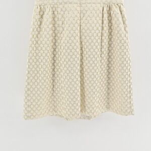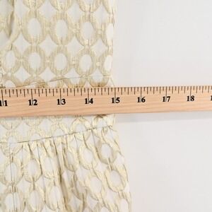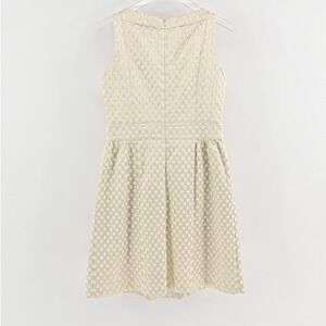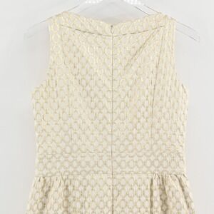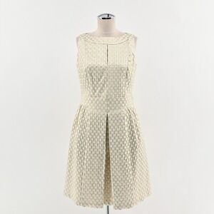 This Lauren Ralph Lauren dress captures timeless elegance with a modern touch. Crafted from a structured metallic jacquard fabric with a subtle geometric pattern, it features a sleeveless bodice, a flattering fitted waist, and a box-pleated skirt that creates graceful movement. Fully lined for comfort with a concealed back zipper, this dress offers both sophistication and ease. Perfect for weddings, cocktail parties, or elegant evening events, it embodies the brand's classic American luxury aesthetic.