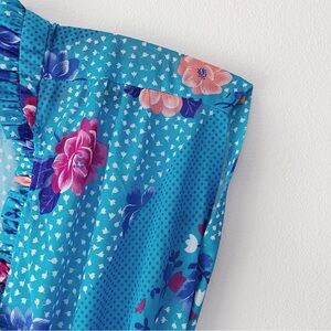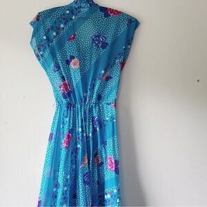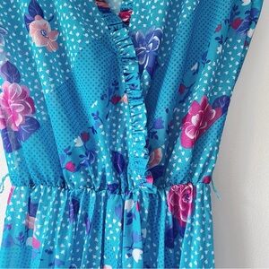 Vintage 80’s blue sheer cap sleeve floral dress. Fabric lays nicely, accordion pleated skirt. Ruffle collar. Tag size 11/12