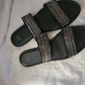 Elevate your style with a new day's black and silver sandals, featuring a chic double strap design adorned with intricate metallic beading. These slip-on sandals combine elegance with comfort, making them perfect for any occasion. The flat sole ensures all-day wearability, while the detailed embellishments add a touch of sophistication to your look.