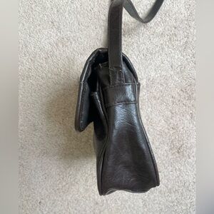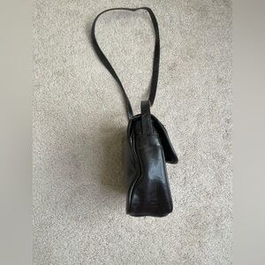 Stylish black leather shoulder bag with a logo detail on the front. Features a long strap for easy carrying.