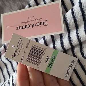NEW Juicy Couture Girls, Sleeveless Hooded Romper shorts, white with black stripes, rainbow elastic waist, signature embroidery on the chest.