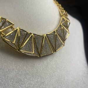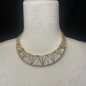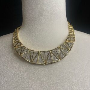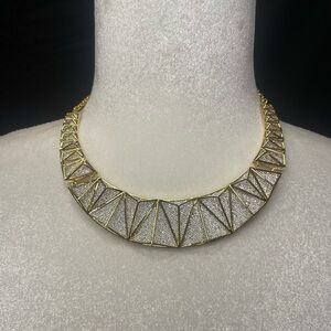 This stunning necklace features a unique geometric design in gold and silver tones. Perfect for adding a touch of elegance to any outfit.