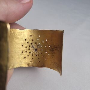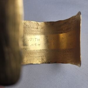 Jusith Haas New York Signed Gold Tone Wide Cuff Bracelet. Signed on inside of cuff. Handcrafted. Measures just under 2" wide with a sundburst detail.