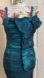 Chic teal mini dress with ruched detailing. Features a stylish bow accent. Ideal for special occasions.