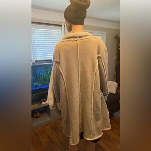 Embrace the warmth and elegance of this stylish Monroe & Main cardigan, featuring a soft tan hue and an open-front design. Its long, flowing silhouette offers a cozy feel, perfect for layering during cooler days. The cardigan's plush texture and off-white faux-fur lining adds a touch of comfort & luxury to any outfit. Also has 2 pockets! Size 2X, see measurements in photos.