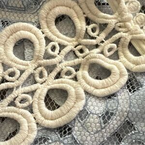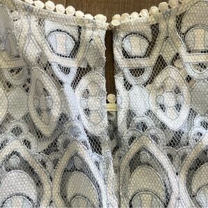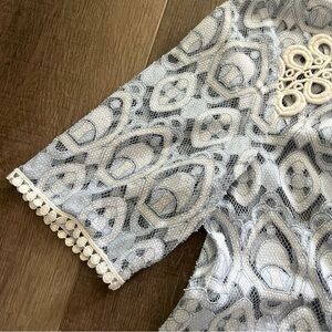 This beautiful sheer lace tunic style top features a geometric mushroom pattern blue lace, inset at the shoulders with a thicker contrasting cream colored lace. Sleeves, neckline and hem are edged with a pretty contrasting lace.