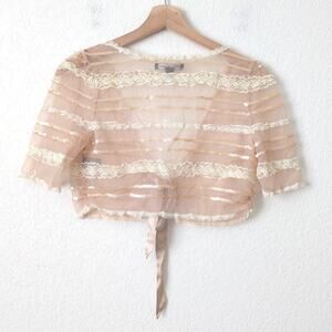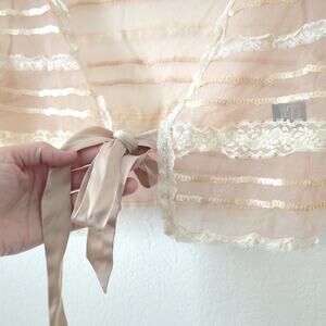 vintage Betsy Johnson New York Y2K 90s cardigan bed jacket mesh with ribbon lace in sequin detail tie ribbon front short sleeve delicate feminine croquette beige