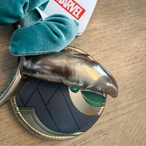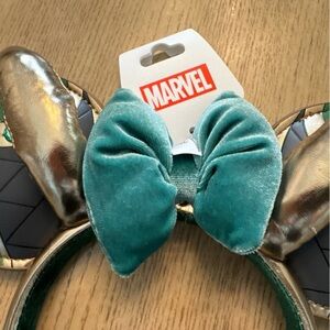 This product is a brand new women's/juniors Loki t-shirt in size XS, with a black color featuring Loki in Teal and olive and Neon green. The set also includes Mickey ears loki design in Gold, Black and Green including a Velvet bow in green & green gems in ears all inspired by Disney and Marvel. The shirt and ears are collectible items that combine elements from both Disney and Marvel franchises, making it a unique and playful addition to any fan's wardrobe.