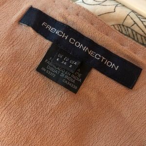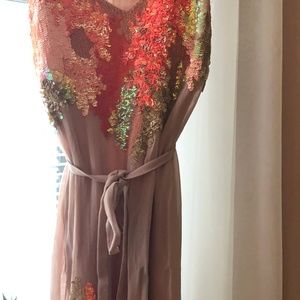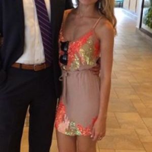 Eye-catching mini dress with bold pink and orange design. Features a V-neck and waist tie. Ideal for a trendy look.