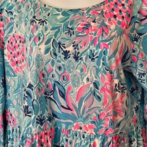 Lilly Pulitzer Geanna Cotton Swing Dress. Tiers on the skirt add texture to the swing fit, while a crew neckline and 3/4 length sleeves offer ettortless style. Supima Cotten jersey tabric.