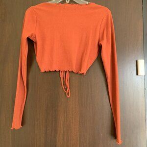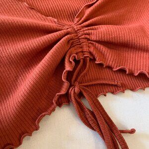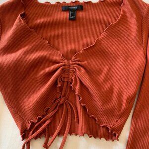 Trendy and flattering, this cropped long-sleeve top from Forever 21 is a fun addition to your wardrobe. Made from soft ribbed fabric in a warm burnt orange hue, it features a deep V-neckline with ruffled trim and an adjustable ruched front with drawstring ties. Ribbed stretch fabric for a comfy fit. Deep V-neck with ruffle detail. Adjustable ruched front with drawstring bow. Cropped length with ruffled hem and cuffs. Perfect for layering or styling solo. Size S.