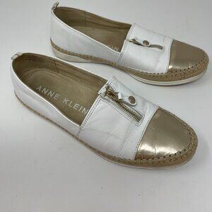 AK Anne Klein Womens ZIPDOWN Leather Loafer Size 8 White Metallic Gold Slip On Espadrille Style sole. Zipper accents at top. Used condition with light wear as shown in photos.