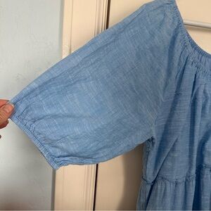 Charming light blue lady’s dress perfect for any occasion. Soft fabric ensures comfort and style. Light with light cotton and side pockets for your keys or phone. Could be worn with a western belt and boots.