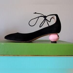 Black, round toe suede shoes with ankle ties and adorable pink ball shaped matryoshka face heels.