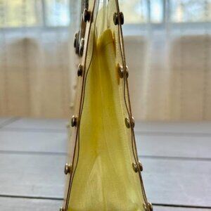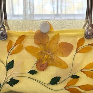 Unique vintage clear acrylic (Lucite) handbag by Nini Ong, featuring real dried flowers and green foliage encased within the clear body.