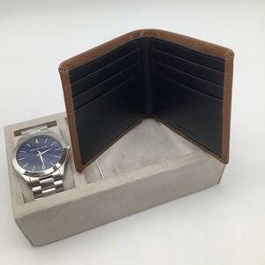 A sophisticated Michael Kors watch and wallet gift set for men. This set includes a sleek stainless steel watch with a striking blue dial and a classic brown textured leather wallet. The watch features a durable metal band and a timeless design, perfect for everyday wear or special occasions. The wallet offers multiple card slots and a clear window for ID, providing ample space for essentials. This ensemble is an ideal choice for formal events, business meetings, or as a distinguished gift.