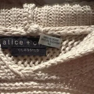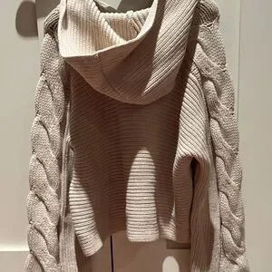 Elegant cream sweater with hood. Features ribbed texture and cable knit sleeves. Ideal for chic layering.
