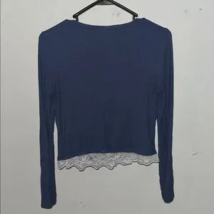 Blue ribbed long sleeve crop top with lace trim detail and button front.