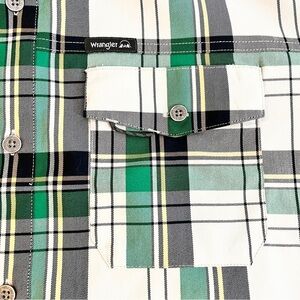 Experience unmatched comfort and style with this brand new Wrangler Short Sleeve Outdoor Utility Shirt. Featuring a green and black plaid pattern, this shirt is designed for versatility and durability, perfect for any adventure.