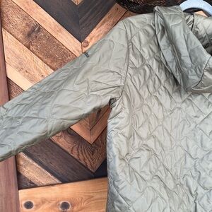 Super light weight and great color! There is a small smudge in the third photo next to the zipper. You can barely see it, smaller than a dime. Fun bomber style with hood.