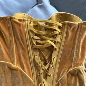 Elegant gold velvet lingerie set. Features a corset with lace-up design. Includes matching panty.