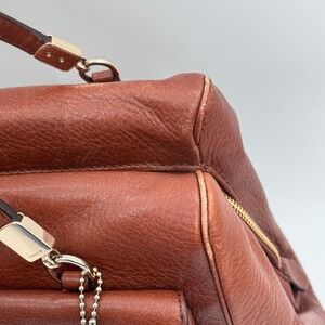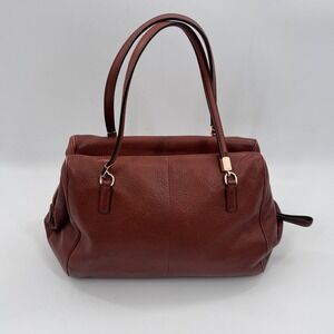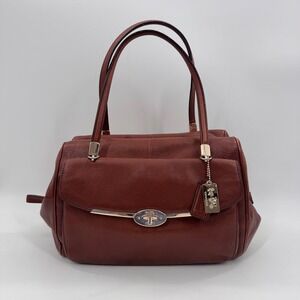 Authentic Coach Madison Madeline East/West satchel in rich brown pebbled leather with brass-tone hardware. Features the classic Coach turnlock closure, structured East/West silhouette, and original hangtag. Zip-top closure opens to a spacious red fabric-lined interior with slip pockets.