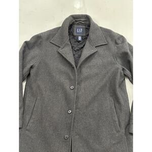 Vtg Wool blend gap peacoat charcoal gray quilted pockets Men’s size Large 3 button closure front, collared, preppy, sophisticated office in good preowned condition see photos for more description